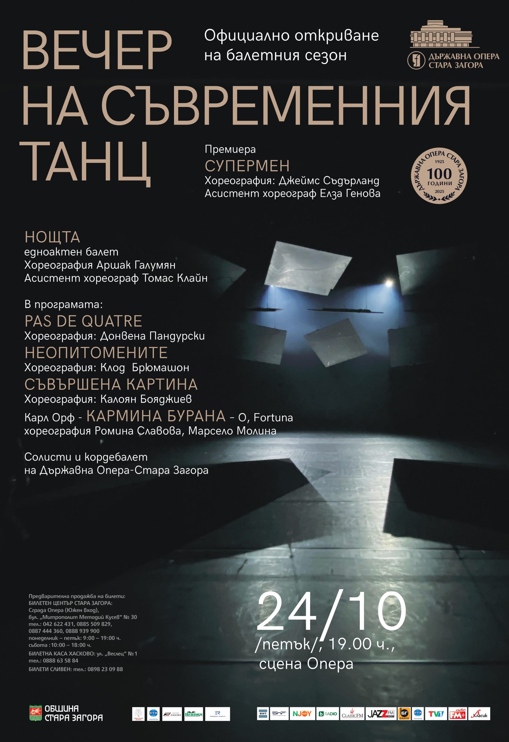 Силвия Томова избира за Вечерта на съвременния танц на 24 октомври две премиерни заглавия на двама световно признати хореографи, които ще украсят богатия репертоарен афиш на талантливата многонационална балетна трупа на Старозагорската опера: „О, Супермен“ на хореографа Джеймс Съдърланд и „Нощта“ на хореографа Аршак Галумян.