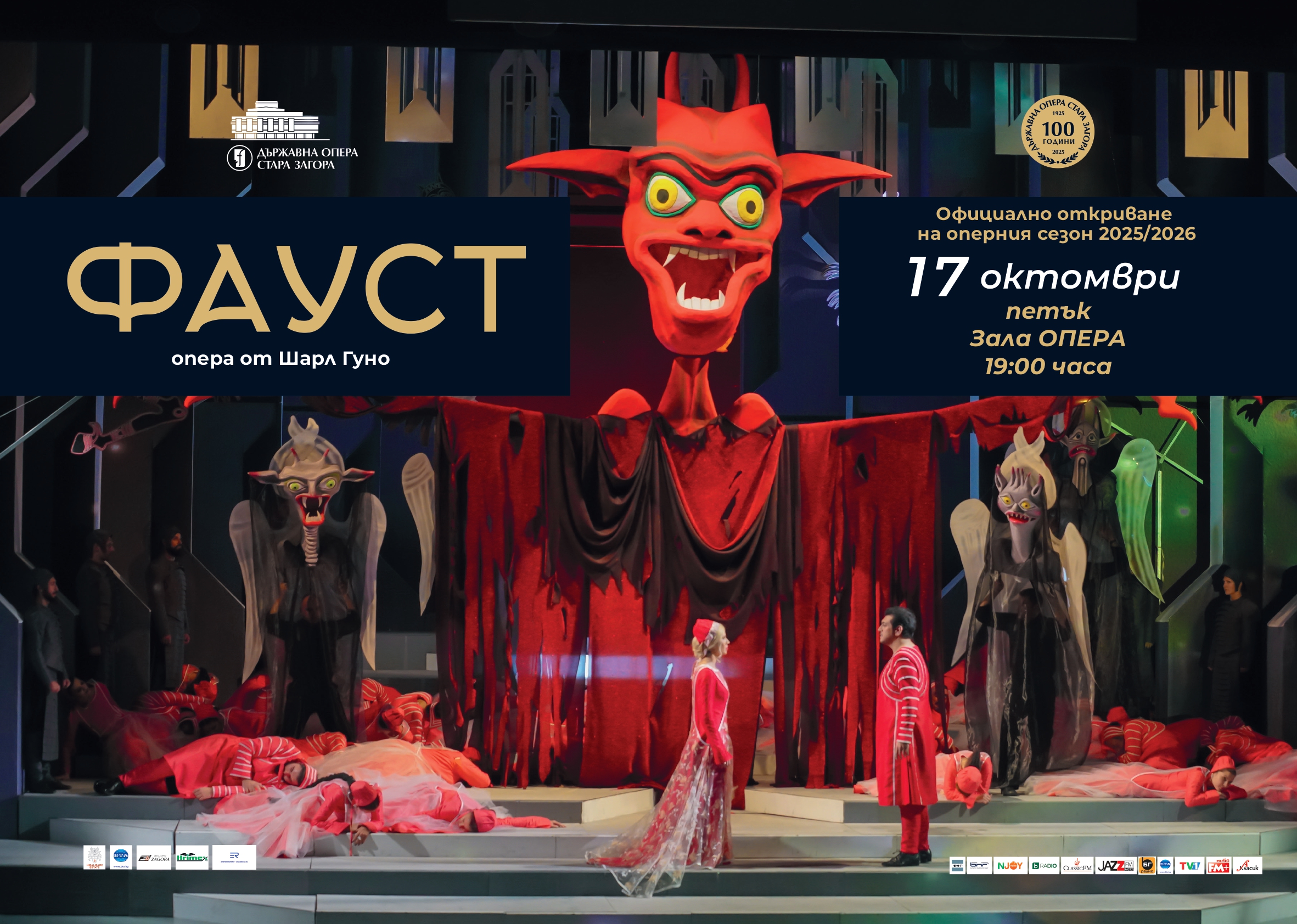 Оперният сезон започва с „ФАУСТ” – удивителната продукция на Старозагорската опера и Държавния куклен театър. Отново на сцена на 17 октомври от 19 часа. Великолепни изпълнители в главните роли ще зарадват почитателите на оперното изкуство: Ивайло Джуров, Габриел Арсе, Беса Лугичи. Солисти, хор, оркестър, балет, куклени артисти и мистичната история на доктор Фауст! Диригент на спектакъла е Григор Паликаров. В главните роли: Николай Моцов, Валери Турманов, Матей Тудосе, Тереза Бракалова, Иван Кабамитов, хор, балет, оркестър, Детско-юношеска студия за опера и балет на Държавна опера-Стара Загора, Актьори от Държавен куклен театър-Стара Загора, Прабългарска школа за оцеляване БагаТур